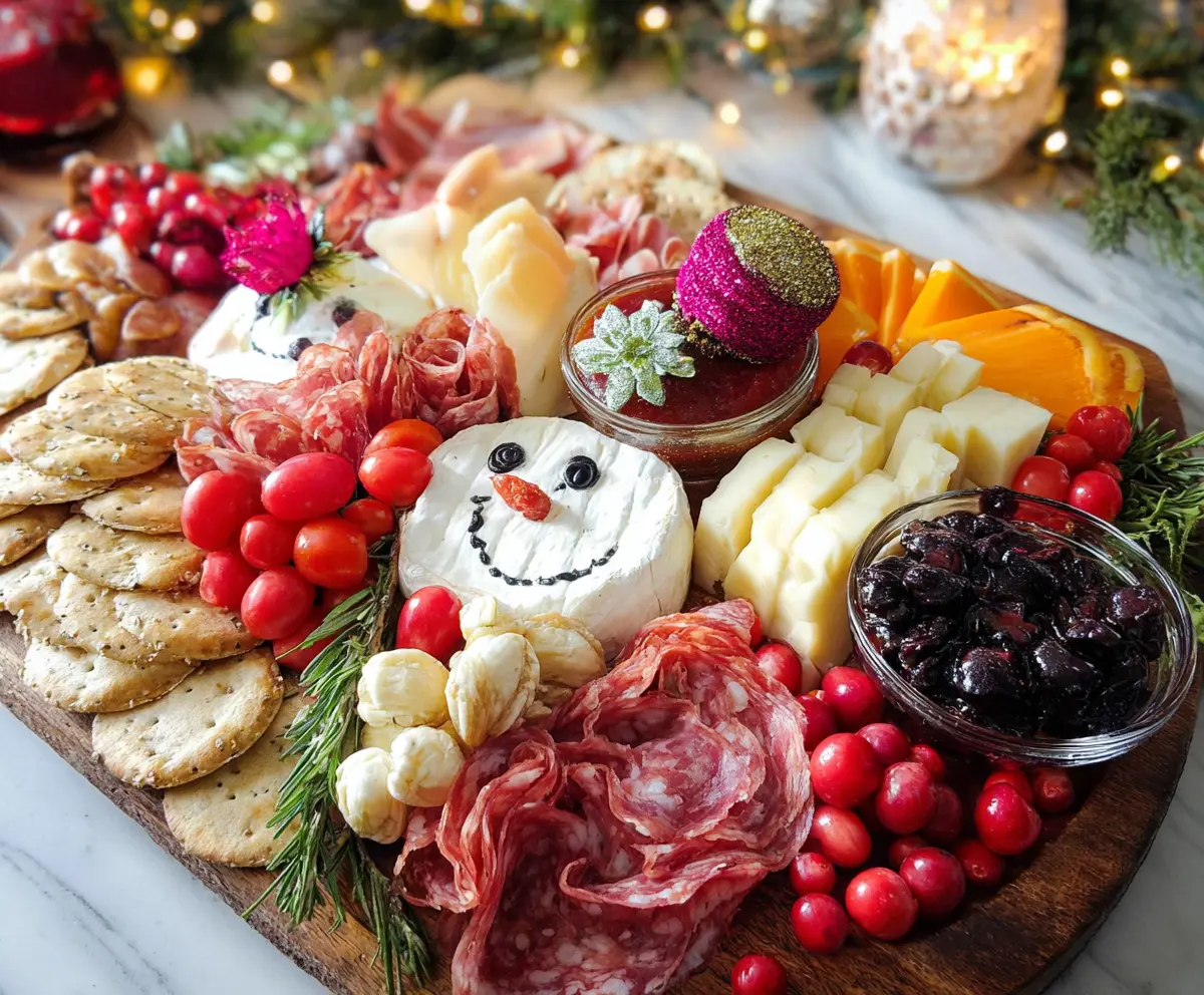 - 1 small Brie wheel (6-8 oz), decorated as a snowman with black olive slices and carrot