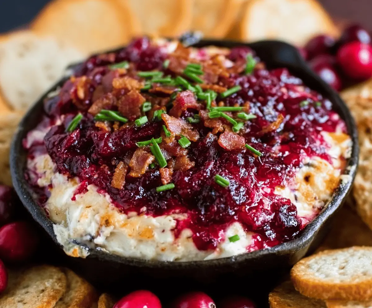 Absolutely! Prepare the dip up to step 3 and refrigerate it covered for up to 24 hours. When ready, add the cranberry sauce and bacon topping, then bake as directed.