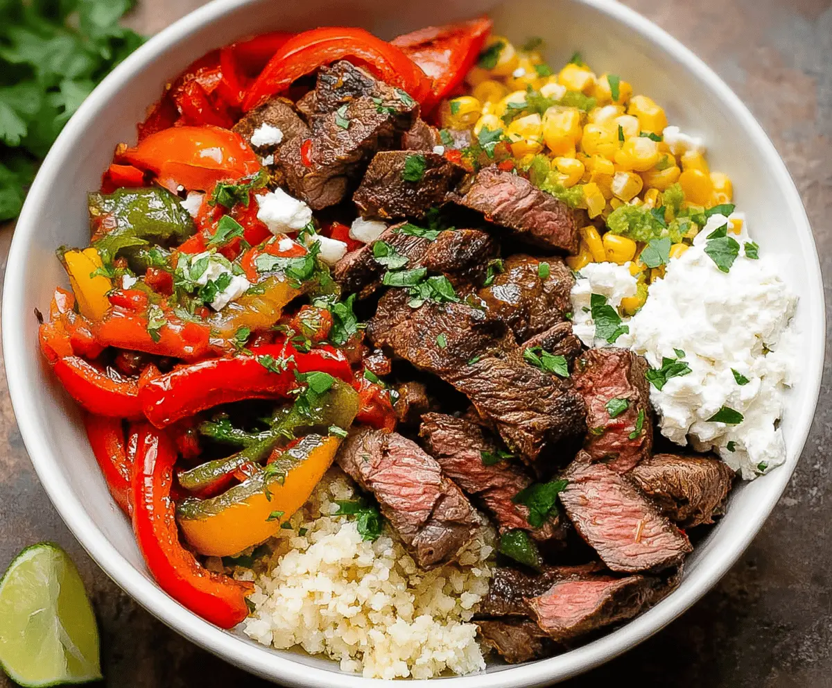 High protein steak fajita bowl with colorful vegetables and low-carb ingredients, perfect for a healthy, low-carb meal