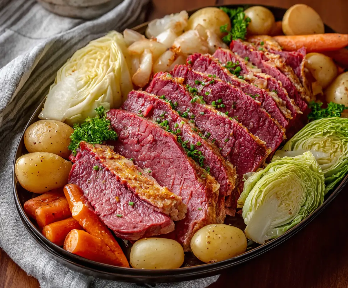 Plate the sliced corned beef with the roasted cabbage, potatoes, carrots, and onions. Finish with a sprinkle of fresh parsley or chives for a pop of color and flavor.