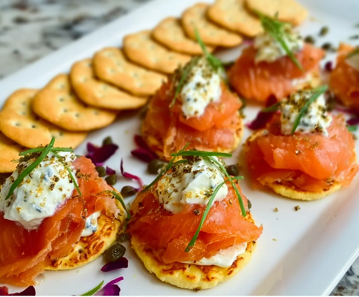 Arrange the smoked salmon appetizers neatly on a serving platter alongside crackers. Optionally, scatter some edible flower petals or small fresh salad greens over the platter for a beautiful, festive presentation. Serve immediately and enjoy!